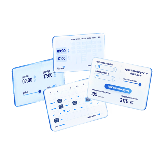 Grownu darbo laiko registravimo sistema eliminuoja rankinį pildymą: registracija per terminalus ar mobiliąją programėlę, integracijos su pamainų planavimu, aiškios ataskaitos ir eksportai. Paskaičiuokite potencialų sutaupymą ir sužinokite, kiek laiko bei pinigų grąžintų automatizacija jūsų įmonei.