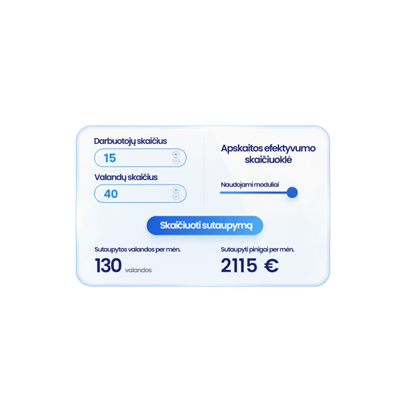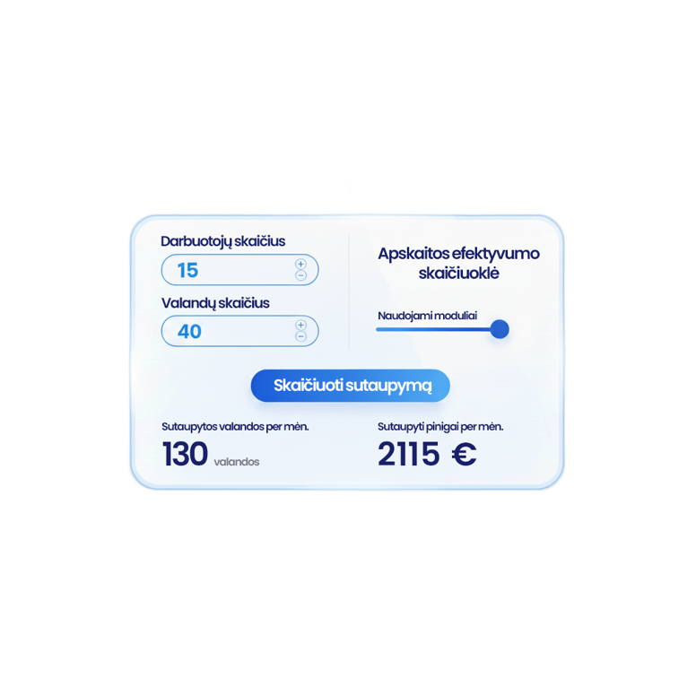 Skaičiuoklė apskaičiuoja tiek tiesioginę finansinę naudą (sutaupytas valandas × valandinį įkainį), tiek nematomą vertę – mažiau streso vadovams, mažiau ginčų dėl darbo valandų, sklandesnį buhalterijos darbą ir greitesnį pasiruošimą auditui. Taip matysite aiškią investicijų grąžą (ROI) pagal aktyvuotus modulius.