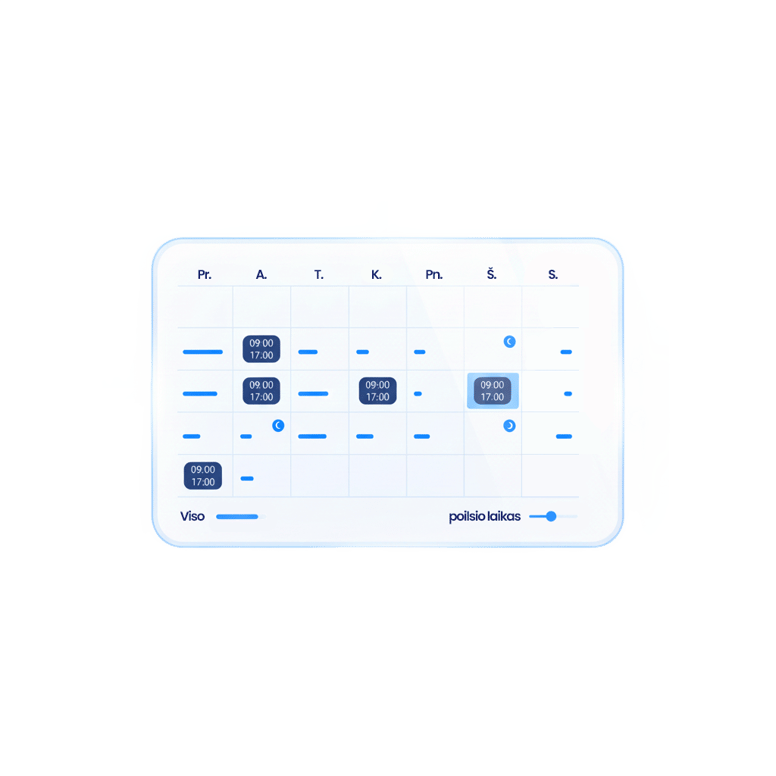 Mėnesio darbo valandų skaičiuoklė leidžia patogiai suvesti kiekvienos dienos pradžią ir pabaigą, pažymėti pertraukas ir, jei reikia, įtraukti naktinį darbą. Įrankis automatiškai susumuoja viso mėnesio darbo laiką, kad greitai paruoštumėte tabelį ar pasitikrintumėte, ar neatsirado viršijimų.