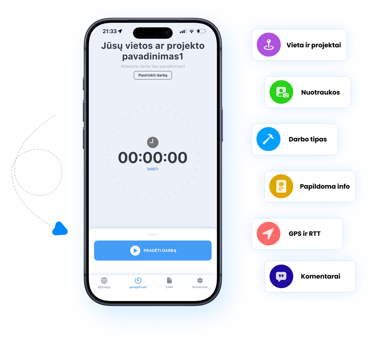 Darbuotojai gali pradėti ir užbaigti darbo laiką, pasirinkti projektą, objektą ar darbo tipą, pateikti reikalingą informaciją ir matyti savo registravimo eigą. Vadovai realiu laiku peržiūri įrašus, stebi situaciją ir valdo procesą iš vienos mobilios aplikacijos.