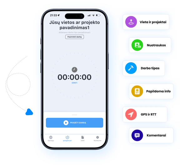 Darbo laikas gali būti registruojamas tiesiai iš užduoties ir automatiškai susiejamas su vieta, darbo tipu, instrukcijomis ir kita užduoties informacija.