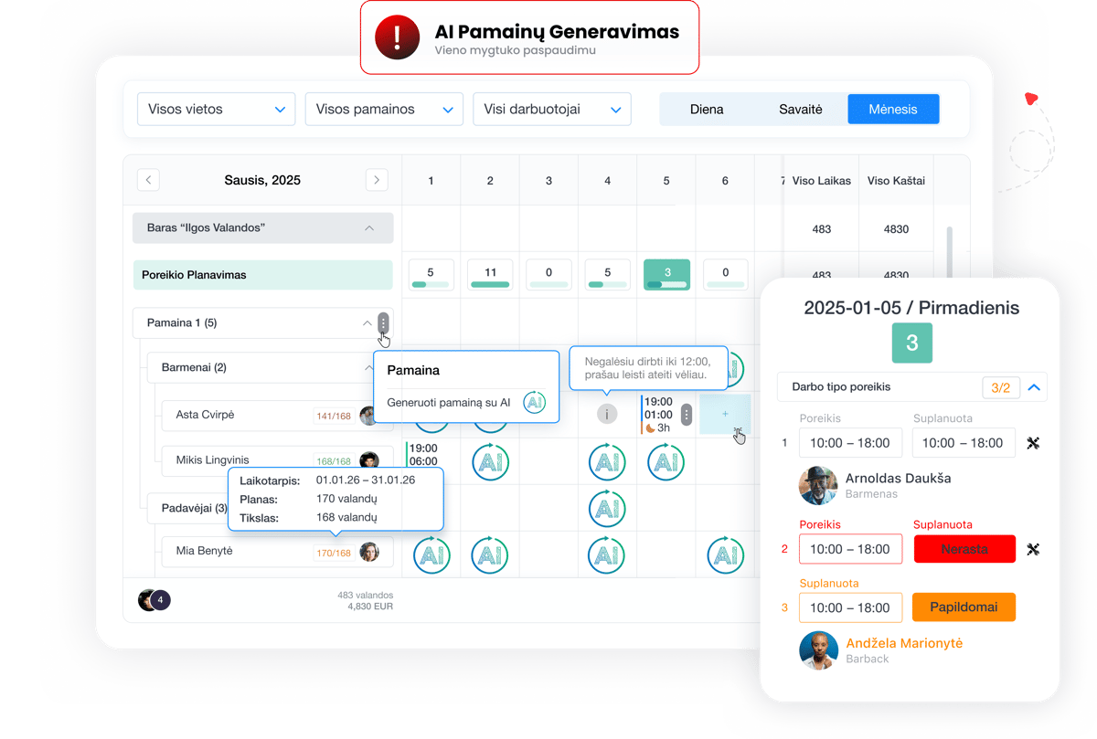 Jei ieškote bendro sprendimo be AI generavimo, peržiūrėkite ir pamainų planavimo modulį, skirtą grafiko sudarymui, publikavimui ir kasdieniam pamainų valdymui.